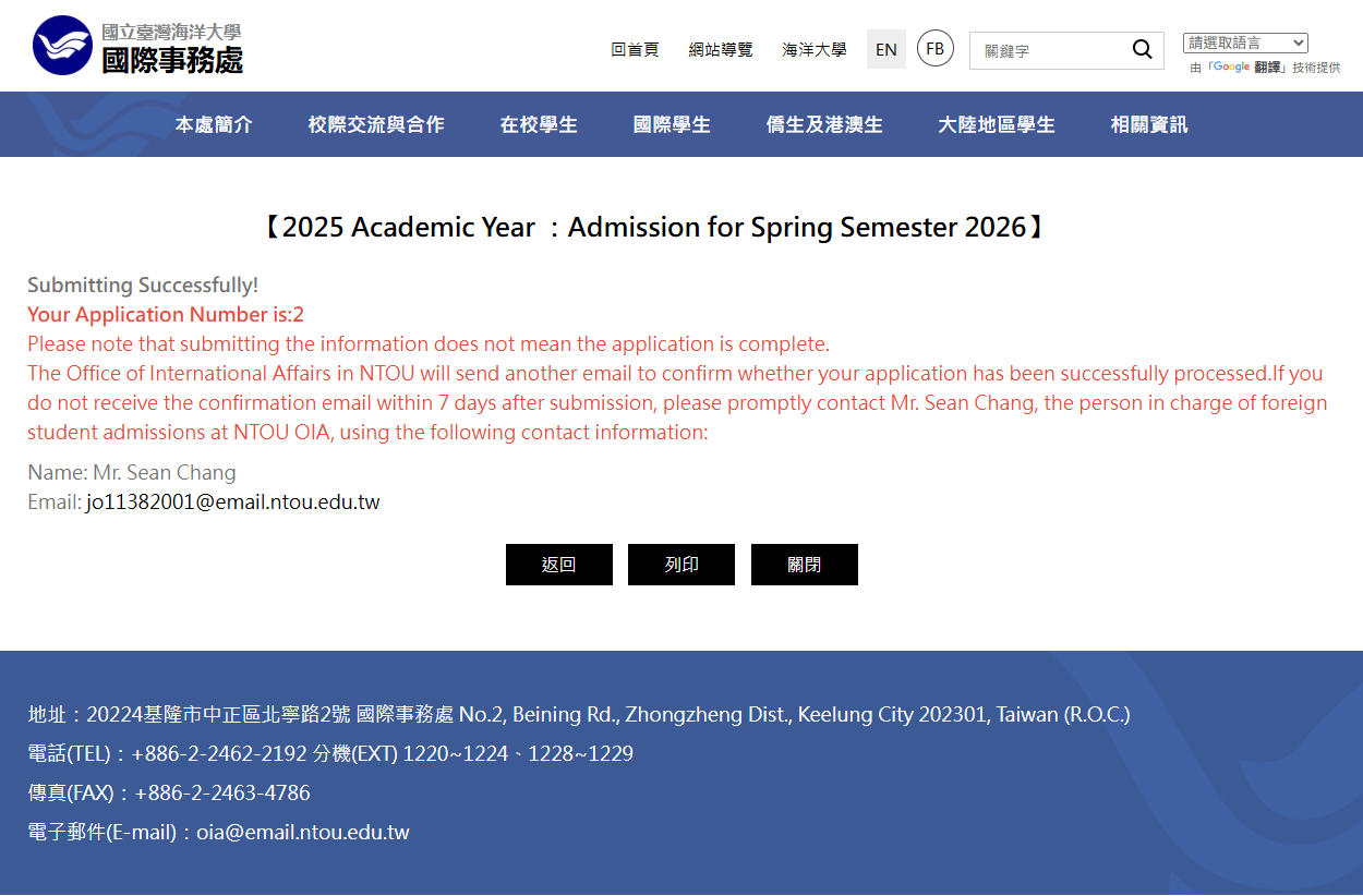 admission application. Please contact NTOU OIA directly for admission application.